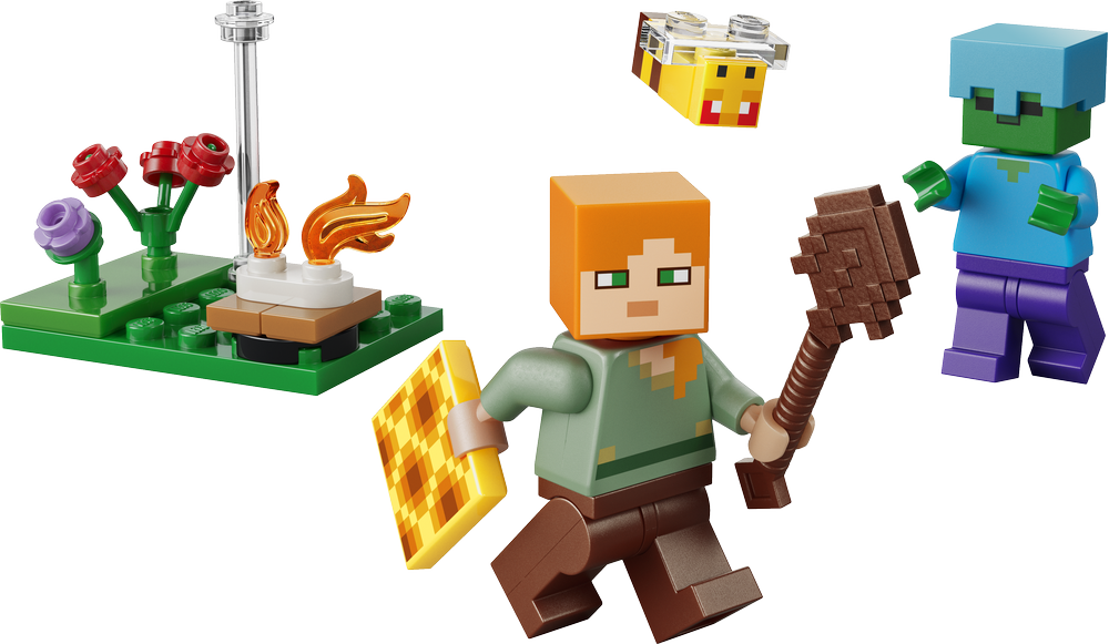 In dem LEGO® Minecraft™ Set (30732) Alex‘ Begegnung am Lagerfeuer machtAlex ein Lagerfeuer und benutzt die Schaufel, um Blumen in das schöne Feld zu pflanzen. Pass auf! Als Alex eine zornige Biene verscheucht, setzt schon ein Zombie zum Angriff an!