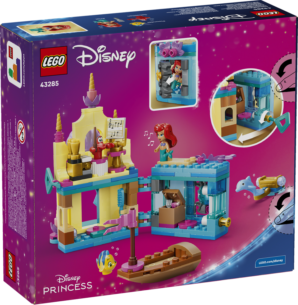 LEGO® ǀ Disney Princess Arielles Magisches Mini-Schloss (43285) ist ein Fantasy-Bauset für Kinder ab 5 Jahren, das Fans des Disney Films Arielle, die Meerjungfrau ihre kreative Seite entdecken lässt. Das Bau- und Spielset stellt eine baubare Mikrowelt dar. Zu diesem LEGO Bauspielzeug für Kinder gehören auch 3 LEGO ǀ Disney Figuren: Arielle, Fabius und Sebastian können das Mini-Schloss erkunden. Mit dem Schlüssel können Kinder die Grotte auf- und zusperren. Und auch kleines Boot lädt zum Spielen ein. Dieses Bauspielzeug mit Mini-Schloss ist für Spielspaß unterwegs gedacht.