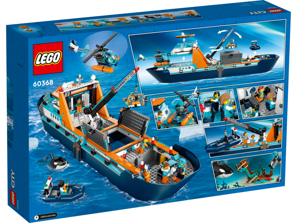 Mit dem großen LEGO® City Arktis-Forschungsschiff (60368) erwarten dein Kind viele Abenteuer. Dieses schwimmfähige Spielzeugboot strotzt vor realistischen Details für fantasievolle Forschungsreisen. Dieses Premium-Spielset beinhaltet außerdem einen Hubschrauber, ein Schlauchboot, eine Unterwasserdrohne und das Wrack eines Wikingerschiffs sowie eine Schatztruhe, 7 Minifiguren und einen Schwertwal.