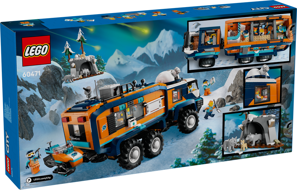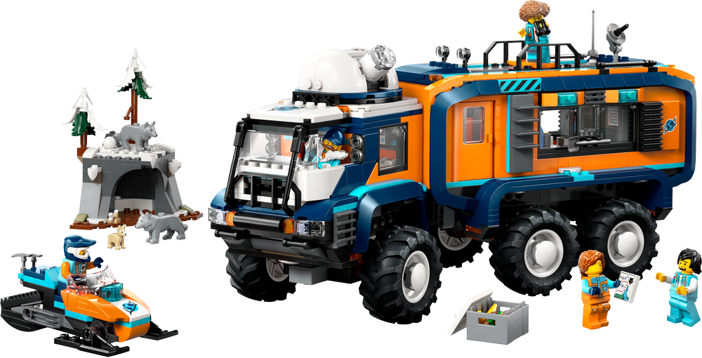 Freu dich auf Abenteuer in der Arktis – mit diesem Arktis-Truck mit Labor. Das 6-rädrige Fahrzeug mit Knicklenkung und grobstolligen Reifen erobert jedes noch so eisige Gelände. Schau dir die Sternwarte auf dem Dach an, mach Tests im Labor und entspann dich im Wohnbereich mit Küche, Bad und Schlafzimmer. Unternimm Expeditionen auf dem Schneemobil und entdecke eine Höhle, in der Polarwölfe leben.