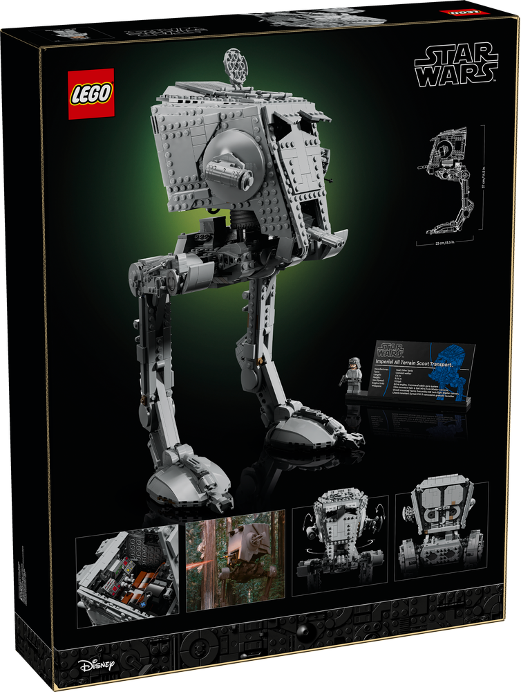 Eine exklusive LEGO Star Wars Minifigur, die einen AT-ST Piloten mit dem Wappen des Imperiums auf den Armen darstellt, und eine Infotafel vervollständigen den spektakulären Hingucker.