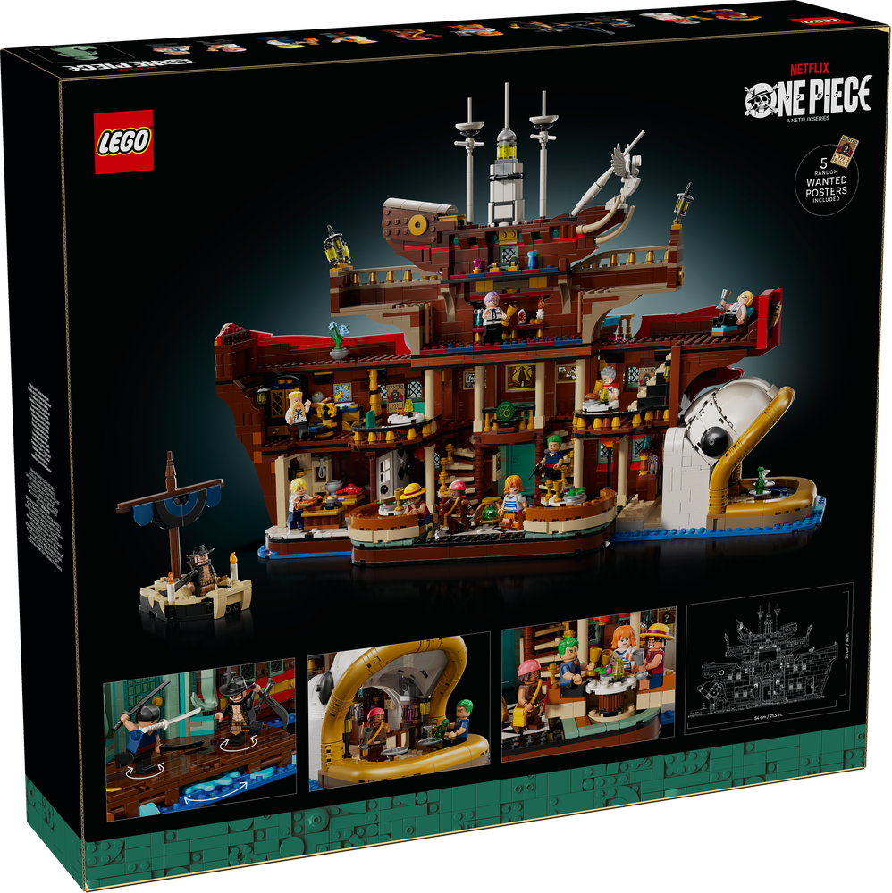 In dem imposanten Blickfang befinden sich viele gut zugängliche Räume, darunter auch die Küche und die Essbereiche, Jeffs Quartier und die Schatzkammer. Klassische Szenen können mit den 10 LEGO Minifiguren nachgestellt werden: Ruffy, Zorro, Nami, Lysop, Sanji, Jeff, Garp, Helmeppo, Corby und Mihawk. Auch authentisches Zubehör wie die 5 Steckbriefe laden zum Spielen ein. In der LEGO Builder App können Baumeister beim Bauen 3D-Ansichten der Modelle vergrößern und drehen und ihren Baufortschritt verfolgen.