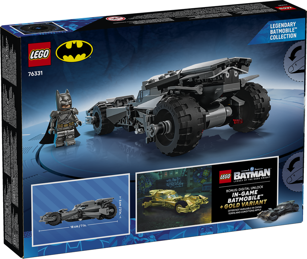 Das Set beinhaltet Batman in seiner Rüstung. Die Minifigur trägt einen Stoffumhang. Außerdem ist ins Cockpit des Batmobils eine goldene Erinnerungsmünze eingebaut