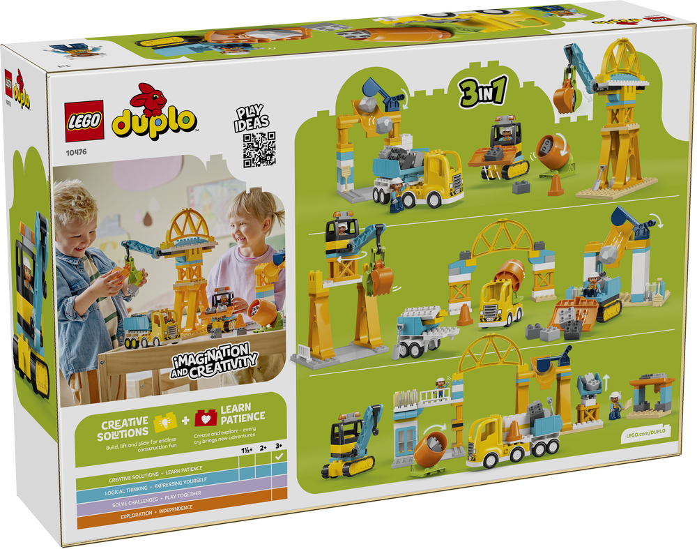 Baustelle mit Baufahrzeugen – 3-in-1-Set (10476) beinhaltet 2 Figuren und 84 Bausteine, um viele LEGO® DUPLO® Town Baufahrzeuge und Bauwerke erschaffen zu können