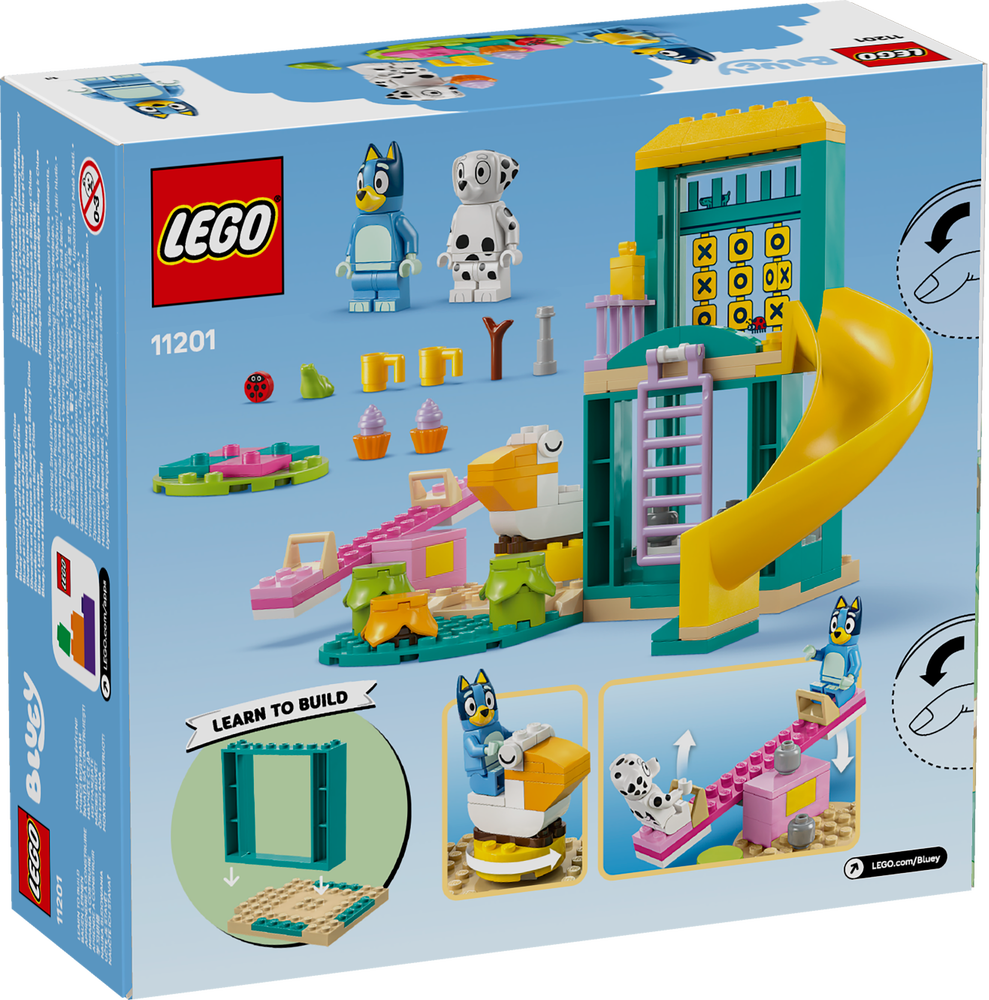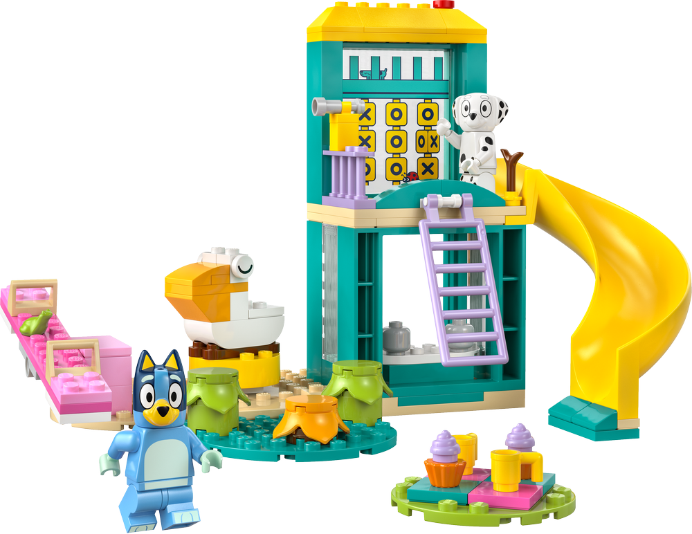 Fans der TV-Serie Bluey können die Minifiguren Bluey und Chloe auf den farbenfrohen Spielplatz mit Wippe, Rutsche, Klettergerüst und Ähnlichem begleiten