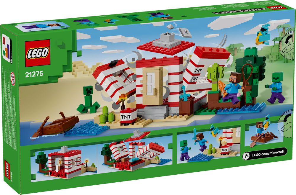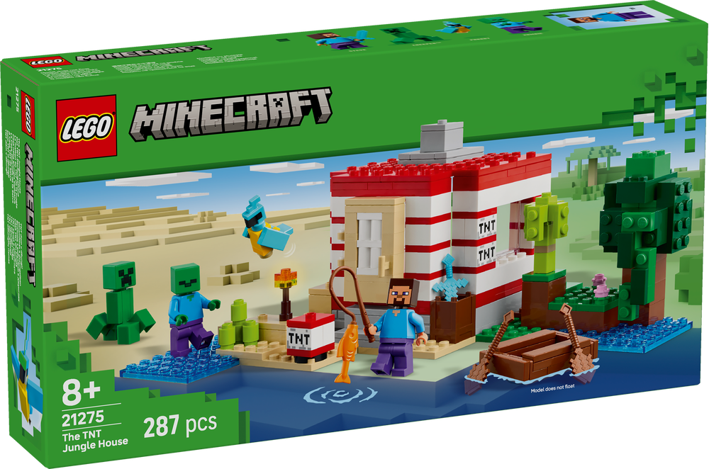 Das baubare Haus steht im Minecraft Dschungelbiom und sieht wie eine große Version des legendären TNT-Blocks aus dem Videospiel aus. Mit dem Schalter an der Seite können Kinder eine TNT-Sprengfunktion auslösen, die das ganze Haus einstürzen lässt. Wenn sich der Staub gelegt hat, bauen die Kinder das Haus wieder auf, um für ihr nächstes Abenteuer bereit zu sein. 3 Minifiguren – Steve, ein Creeper™ und ein Zombie – lassen Kinder fantasievoll spielen. Ein Boot, eine Angelrute, ein Fisch, ein Papagei und Dschungellaub sind nur einige der authentischen LEGO Minecraft Zubehörelemente. Zusätzlichen digitalen Bauspaß bietet die LEGO Builder App. Kinder können in der App auf ihrem Mobilgerät 3D-Modellansichten vergrößern und drehen. Besteht aus 287 Teilen.