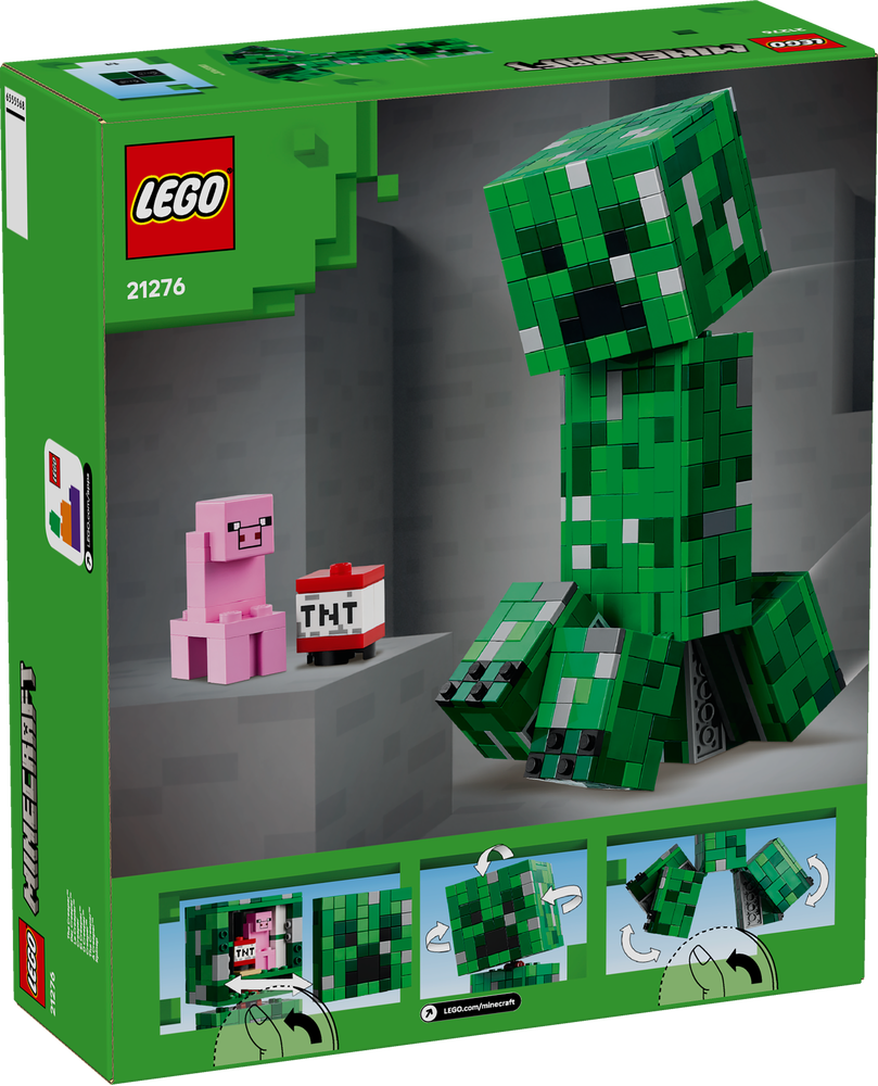 Die baubare Spielzeugnachbildung des legendären Creepers aus Minecraft ist 21 cm groß. Die Actionfigur kann ihre Beine bewegen und ihren Kopf zur Seite drehen und neigen. Nimmt man die Vorderseite des Kopfes des LEGO Minecraft Creepers ab, kommen ein TNT-Block und eine kleine Version des ersten Creepers zum Vorschein. Zusätzlichen digitalen Bauspaß bietet die LEGO Builder App. Kinder können in der App auf ihrem Mobilgerät 3D-Modellansichten vergrößern und drehen. Besteht aus 665 Teilen.