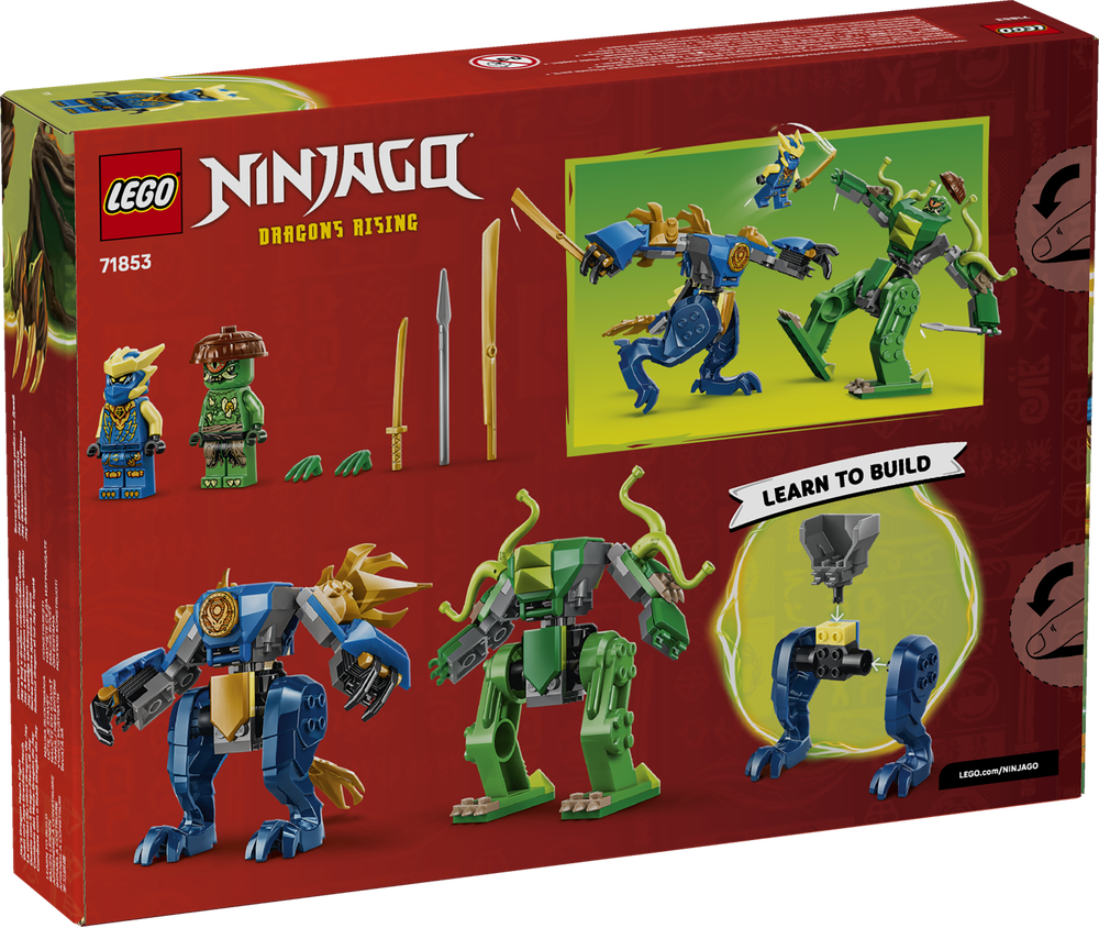 Jays Drachen-Mech hat ein aufklappbares Minifigur-Cockpit (für Jay selbst) und kann Schwanz, Flügel, Arme, Beine, Körper und Finger bewegen. Der Mech des Mutationsmonsters hat ebenfalls ein Minifigur-Cockpit (für das Mutationsmonster) und kann seine Tentakeln, Arme, Beine sowie den Oberkörper bewegen. Zum Set gehören außerdem 2 Schwerter, ein Speer und ein Satz Klauen. Diese austauschbare Ausrüstung bietet Kindern jede Menge Spielspaß.