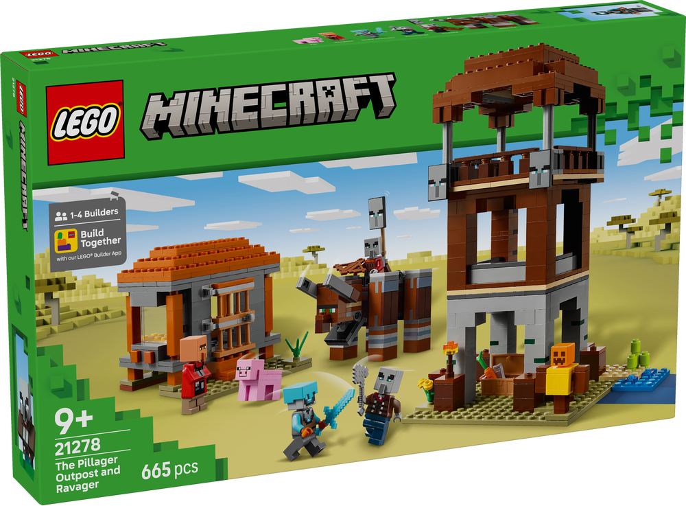 Das Set beinhaltet 4 LEGO Minecraft Minifiguren: eine Weltraumwache, einen Räuberhauptmann, einen Maurer und einen Diener. An dem baubaren Verwüster befindet sich ein Hebel, mit dem man seinen Kiefer schnappen und seinen Kopf Rammbewegungen vollführen lassen kann. Zu dem dreigeschossigen Wachturm führt eine Leiter hinauf. Auf Bannern sind Gesichter von Plünderern dargestellt. Und in der Truhe liegt kostbare Beute. Die Tür zum Haus des Maurers lässt sich aufklappen. Drinnen stehen ein Bett und ein Steinmetz. Das Set beinhaltet auch ein LEGO Minecraft Schwein und Zubehör, unter anderem eine Trainingspuppe, eine Fackel, eine Karotte, einen Eisenbarren, einen Diamanthelm, ein Diamantschwert, eine Armbrust und eine Eisenaxt. Zusätzlichen digitalen Bauspaß bietet die LEGO Builder App. Kinder können in der App auf ihrem Mobilgerät 3D-Modellansichten vergrößern und drehen. Besteht aus 665 Teilen.