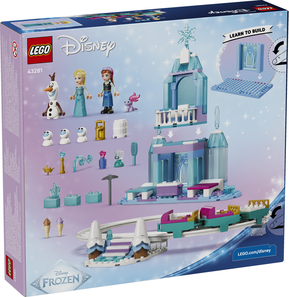 Elsas Schlittenfahrt um den Eispalasat (43281) ist ein Bau- und Spielset mit 7 LEGO® ǀ Disney Frozen Figuren, einem 2-geschossigen Palast und einer Schienenstrecke mit 3 Schlittenwagen