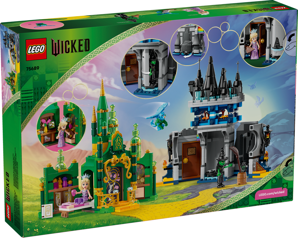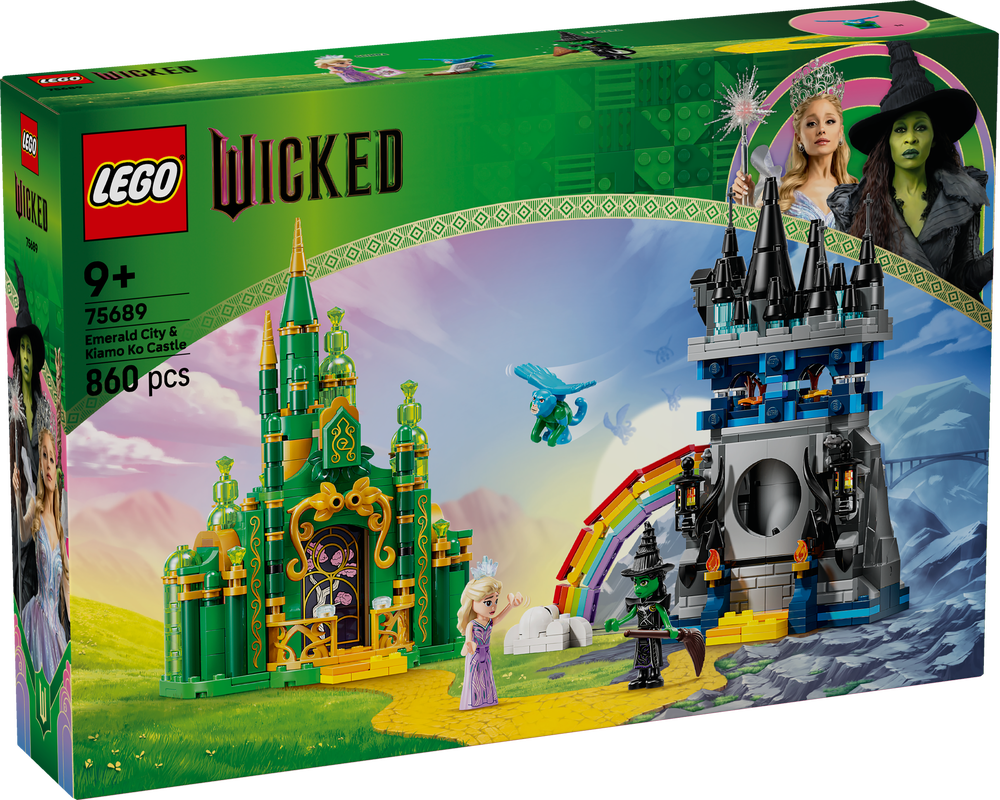 Emerald City & Kiamo Ko Castle (75689) ist ein Bauspielzeug, das Kinder ab 9 Jahren unzählige Abenteuer aus Wicked nachspielen lässt. Mädchen, Jungen und Fans der Filme können in die Rollen von Glinda in Emerald City und von Elphaba in Kiamo Ko Castle schlüpfen, um das emotionale Ende von Wicked: For Good nachzustellen.