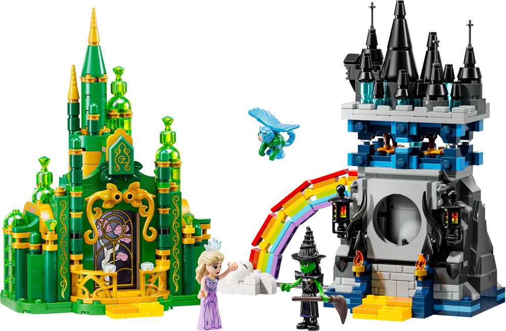Emerald City & Kiamo Ko Castle ist ein Bau- und Spielset mit 2 baubaren Modellen, den LEGO Wicked Spielfiguren Elphaba und Glinda, einem fliegenden Affen und einem baubaren Regenbogen