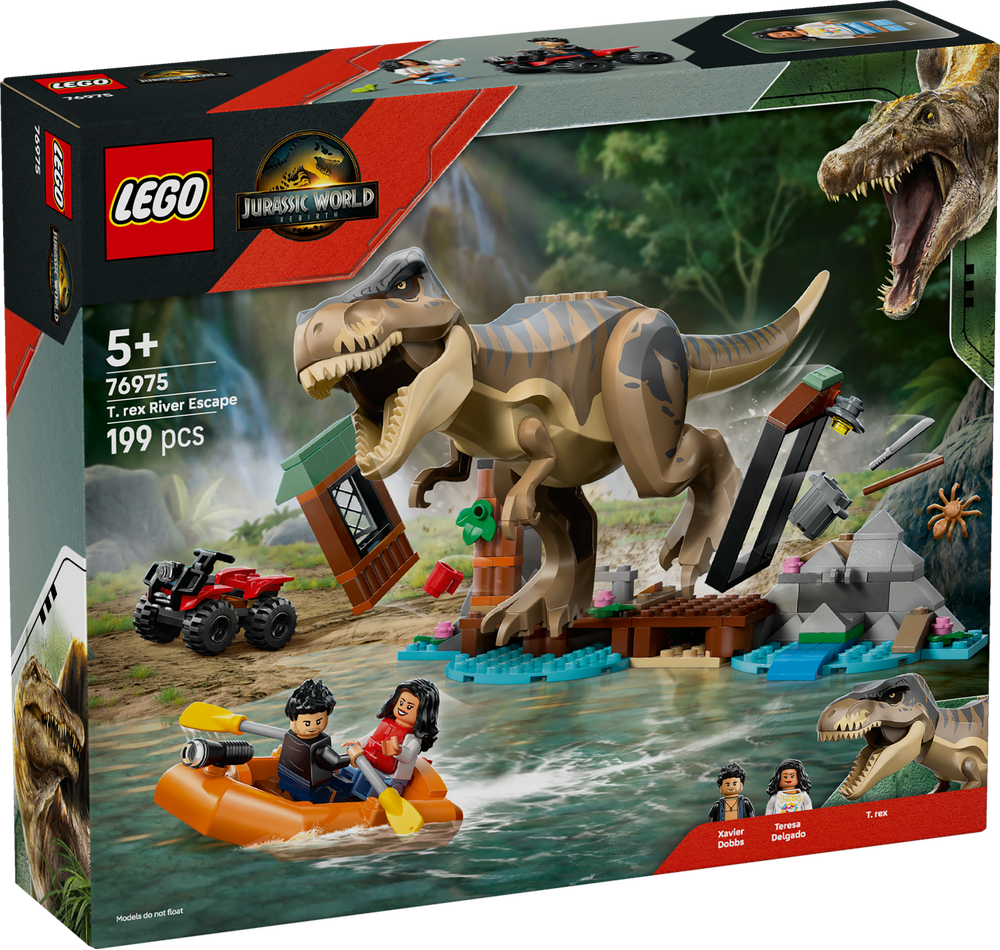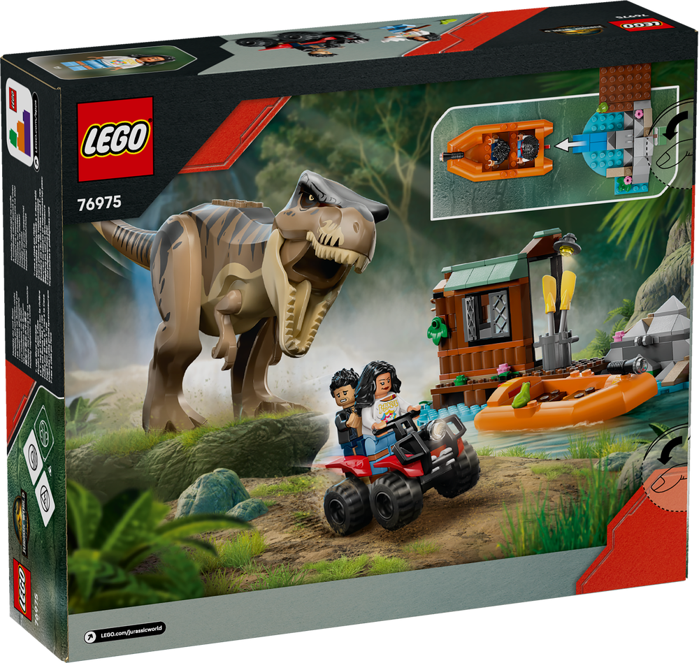 Mit diesem detailreichen LEGO® Jurassic World Bauset können Kinder und Fans ab 5 Jahren eine spannende Filmszene aus Jurassic World Rebirth nachspielen oder eigene Dino-Abenteuer darstellen. Flucht vor dem T.Rex (76975) ist ein leicht zu bauendes Spielset und ein tolles Geburtstagsgeschenk. Das Set beinhaltet einen gegossenen T.Rex, der Arme, Beine, Schwanz, Kopf und Maul bewegen kann. Auch die beiden Minifiguren Teresa Delgado und Xavier Dobbs laden zum Spielen ein. Es gibt auch einen Schuppen, der zerstört werden kann, ein Bootkatapult, ein Boot und ein Quad für viele spannende Abenteuer.