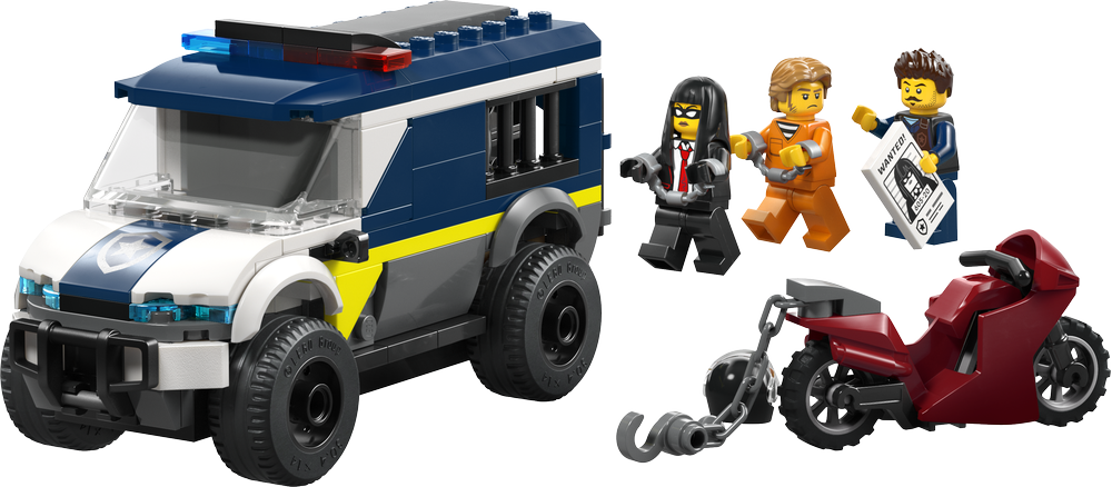 Kinder können eine Minifigur den Polizeitransporter steuern lassen, die beiden Gefangenen in die Bordgefängniszelle sperren und die Zellentür mit dem Haken am Motorrad wegreißen, um packende Befreiungsaktionen zu wagen
