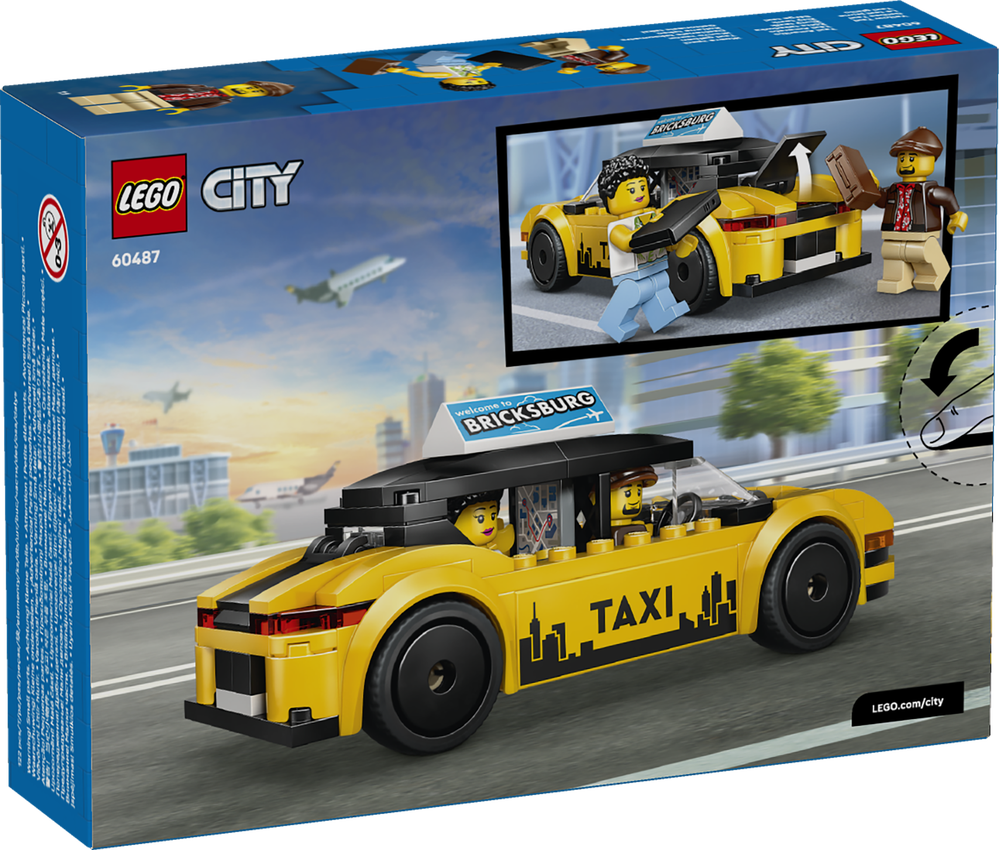 LEGO® City Gelbes Taxi (60487) ist ein Bauset, das Kindern ab 5 Jahren, die Spielzeugautos lieben, doppelten Spielspaß bietet. Das gelbe Taxi aus diesem Bauset sieht aus wie ein modernes Elektroauto. Öffne den Kofferraum, in dem Gepäck verstaut ist, und die Motorhaube, unter der ein Elektromotor sitzt. Bedruckte Aufkleber stellen ein Navi-Display, ein Taxi-Logo, Werbung auf dem Dach und einen Akku dar. Kinder können das Dach abnehmen, um eine Minifigur ans Steuer zu setzen und die andere mit dem Taxi zu befördern. Freu dich auf fantasievolle Geschichten.