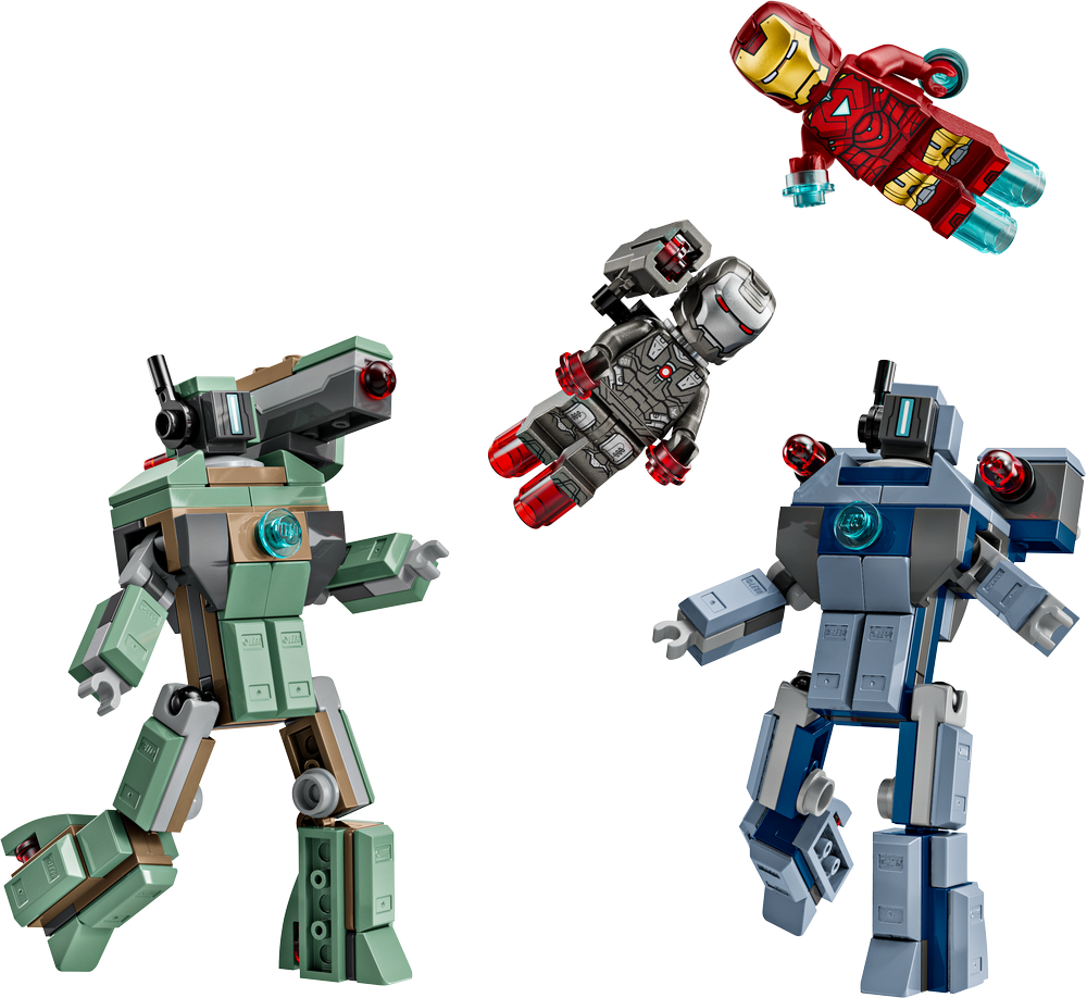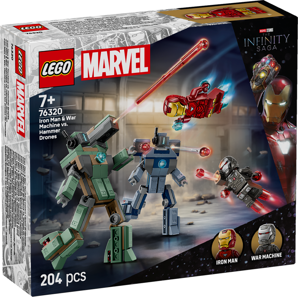 Das Bauspielzeug stellt das legendäre Duell ausIron Man 2 aus den Marvel Studios dar. Das Spielset beinhaltet die Minifiguren Iron Man und War Machine sowie 2 baubare Hammer-Drohnen. Kinder können die voll gelenkigen Hammer-Drohnen in dynamische Actionposen bringen. Die grüne Hammer-Drohne trägt einen Shooter mit Federmechanismus auf der Schulter. Die Shooter auf den Schultern der blauen Hammer-Drohne werden durch Drücken abgefeuert. War Machine hat rote Blaster an Händen und Füßen und einen Shooter auf der Schulter. Iron Man hat blaue Blaster an Händen und Füßen und kann Laserstrahler in den Händen halten. Zusätzlichen digitalen Bauspaß bietet die intuitive LEGO Builder App. In der App können Baumeister der 3D-Ansichten der Modelle vergrößern und drehen und ihren Baufortschritt verfolgen. Das Set besteht aus 204 Teilen.