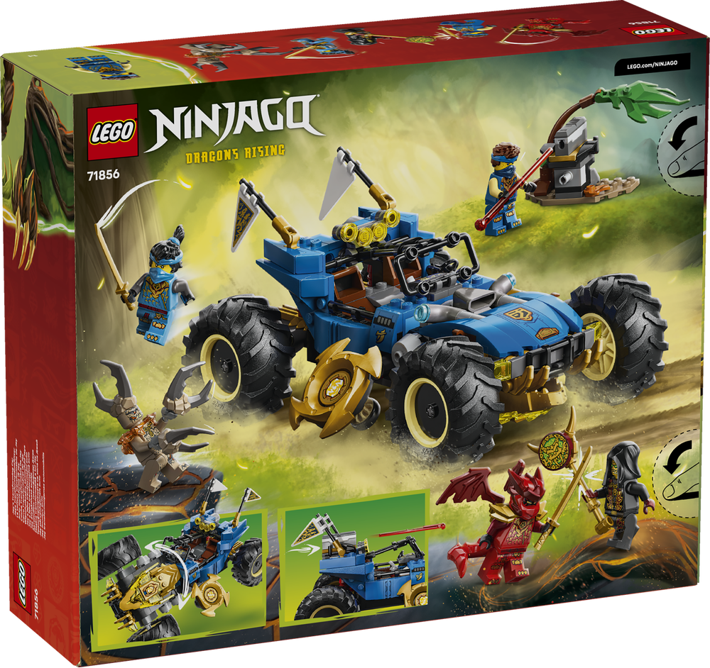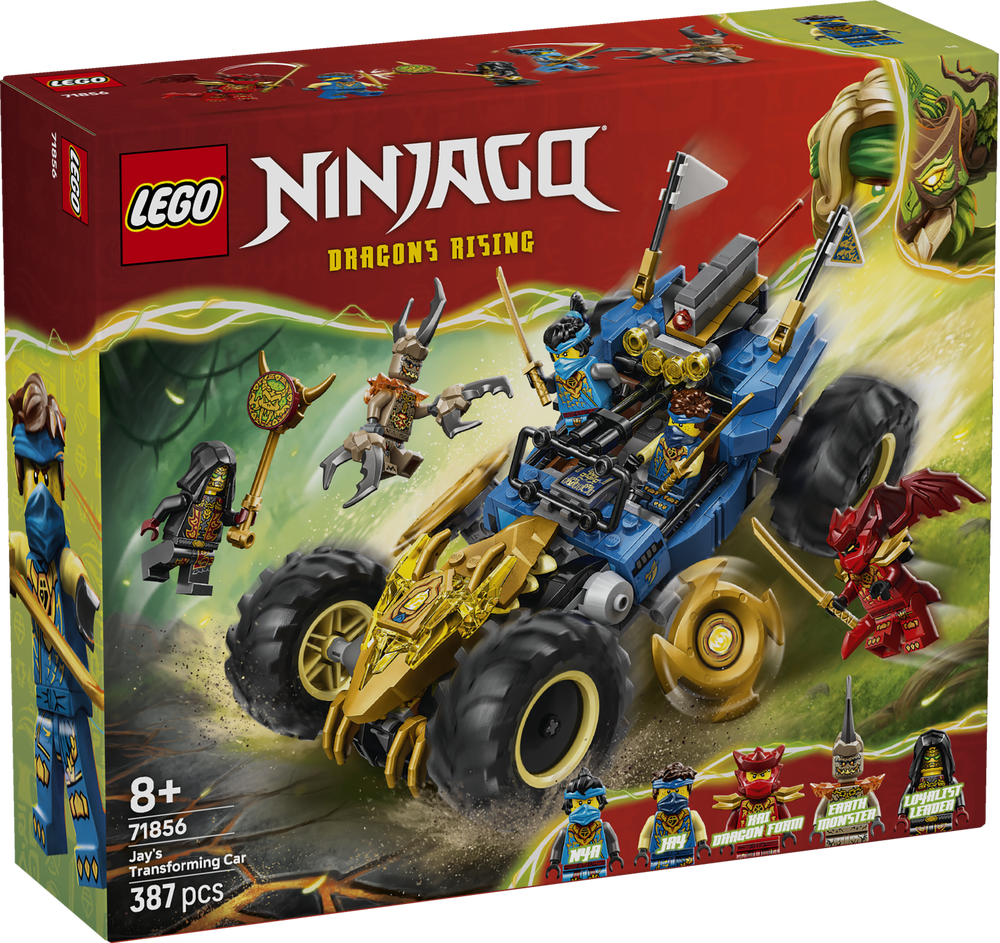 Jays Transformationsflitzer (71856) ist ein Bauspielzeug, mit dem Ninja-Fans ab 8 Jahren die rasanten Actionszenen aus der 4. Staffel der TV-Serie NINJAGO® Aufstieg der Drachen nachspielen können