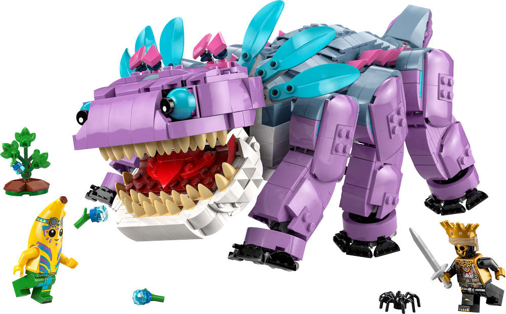 Klombo ist ein großes Monster aus dem Videospiel LEGO Fortnite. Dieses Bauset lässt Jungen und Mädchen das Monster mit LEGO Steinen nachbilden. Kinder bauen zunächst das Spielzeug zum Videospiel und entdecken dann all die coolen Details, beispielsweise die beweglichen Beine, das aufklappbare Maul und den drehbaren Schwanz. Zum Set gehört auch ein kleiner Klombeerstrauch mit abnehmbaren Klombeeren. Kinder können so tun, als würden sie Klombo ärgern und ihn dann mit Klombeeren besänftigen, um sich mit ihm anzufreunden. Für fantasievolle Rollenspiele kann man die Minifiguren Inselabenteuer-Schali und Oro auf Klombos Rücken setzen.