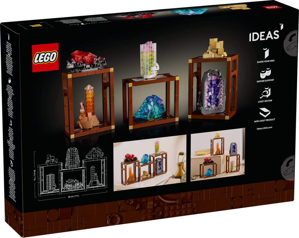Feiere die Schönheit der Natur mit der LEGO® Ideas Mineraliensammlung. Das Set besteht aus 6 nachgebildeten farbenfrohen Mineralien und 3 Regalmodulen