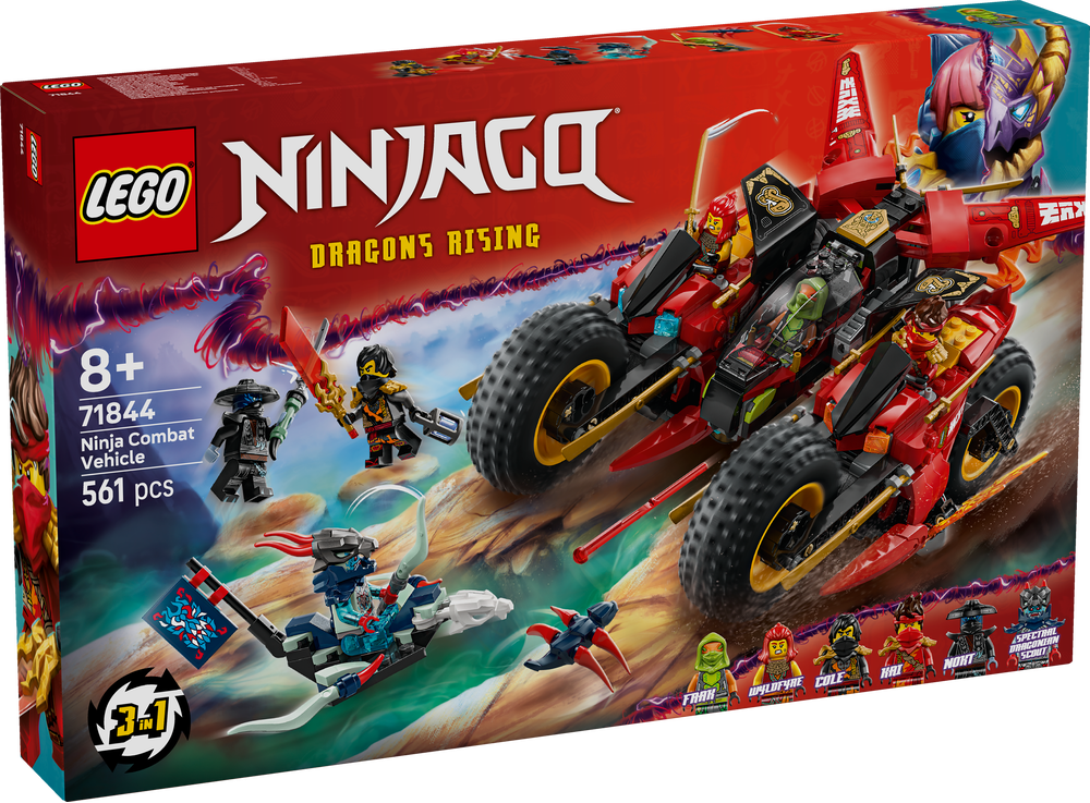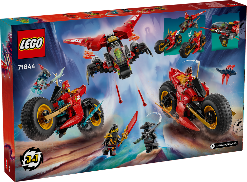 Der Ninja-Actionflitzer (71844) aus diesem 3-in-1-Spielset lässt Kinder ab 8 Jahren packende Szenen aus der 3. Staffel der TV-Serie NINJAGO® Aufstieg der Drachen nachstellen. Kinder können zunächst mit dem großen Actionflitzer spielen und ihn dann in 3 kleinere Fahrzeuge zerlegen. Dann bieten Kais Ninja-Bike, Wyldfyres Ninja-Bike und Fraks Jet mit 2 Shootern noch mehr Actionspaß.