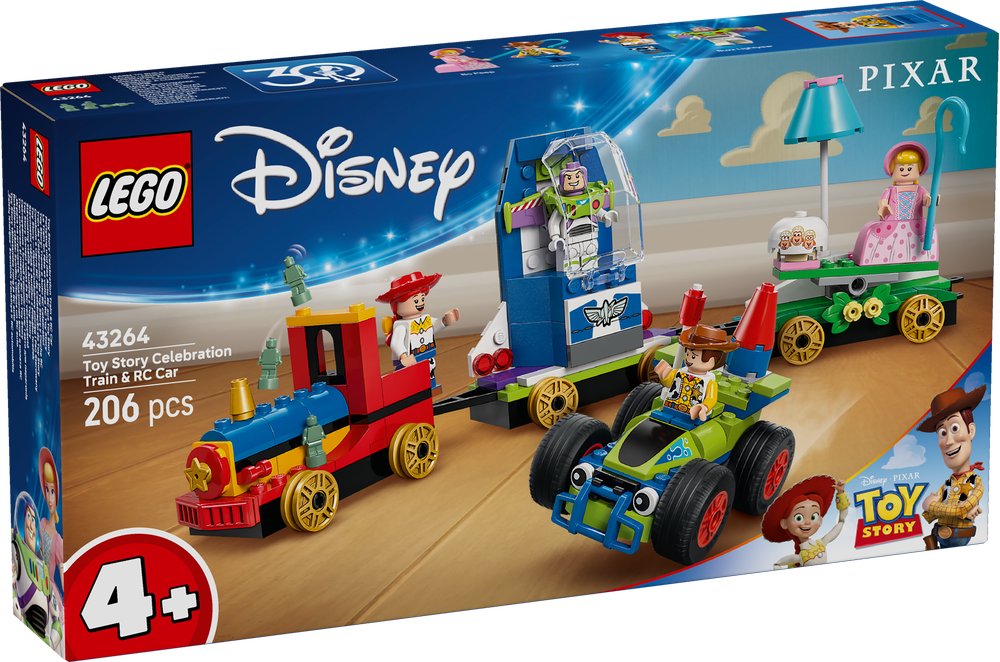 Kinder ab 4 Jahren, die Fahrzeuge und Eisenbahnen lieben, werden in diesem LEGO® ǀ Disney Bauset fündig. Partyzug und das Auto RC aus Toy Story (43264) bringt Kindern das Bauen bei und lässt sie das 30-jährige Jubiläum des Kinoerfolgs Toy Story von Disney and Pixar mit einer Western-Lok, 2 Umzugswagen und einem Auto feiern. An Bord der Umzugswagen befinden sich eine Wippe und ein Raumschiff. Zu dem Bauset gehören auch 4 LEGO ǀ Disney and Pixar Charaktere: Woody, Jessie, Porzellinchen und Buzz Lightyear.