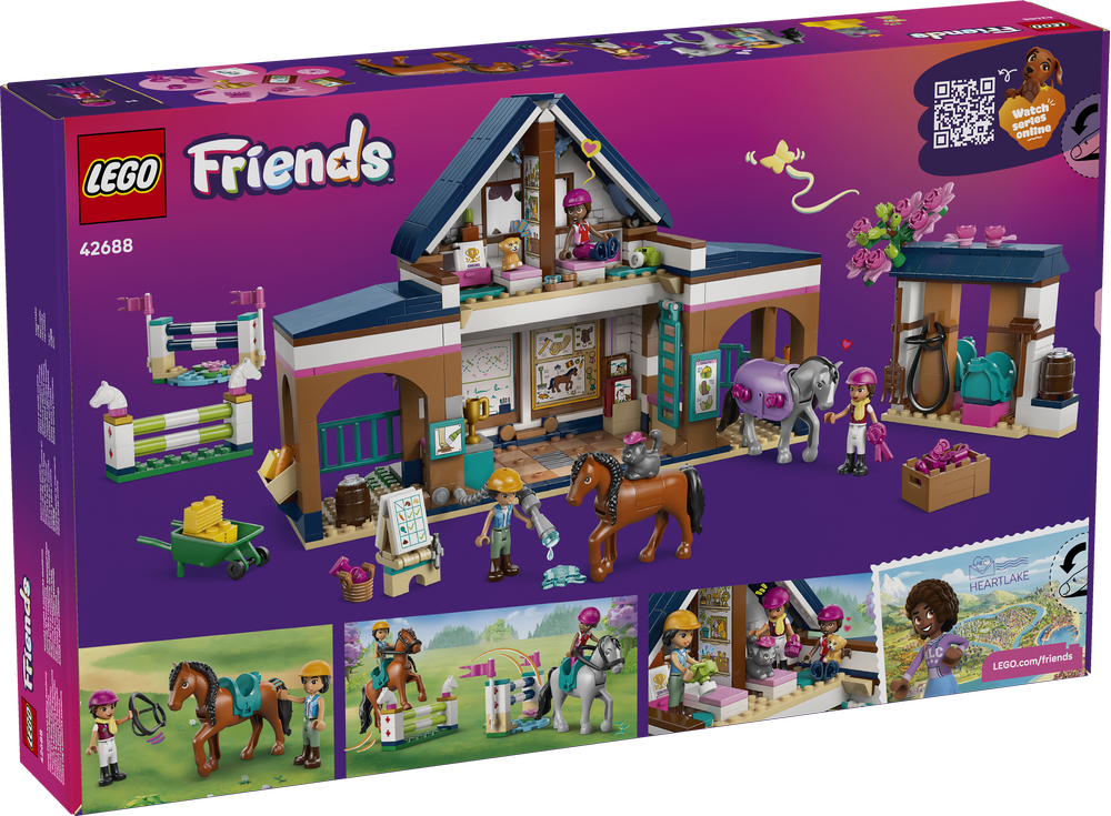 LEGO® Friends Pferdestall und Reitschule (42688) bietet Kindern ab 7 Jahren jede Menge Spielspaß und Pferdeabenteuer mit und ohne Sattel. Liann und Aliya nehmen Reitstunden bei der Reitlehrerin Cindy und lernen, wie man Pferde versorgt und pflegt. Sattle die beiden Pferde und spring über die Hindernisse. Probier verschiedene Aufgaben aus: Transportiere das Heu mit der Schubkarre oder putze und füttere die Pferde. Nach dem aufregenden Tag kannst du in den gemütlichen Betten über dem Stall übernachten.
