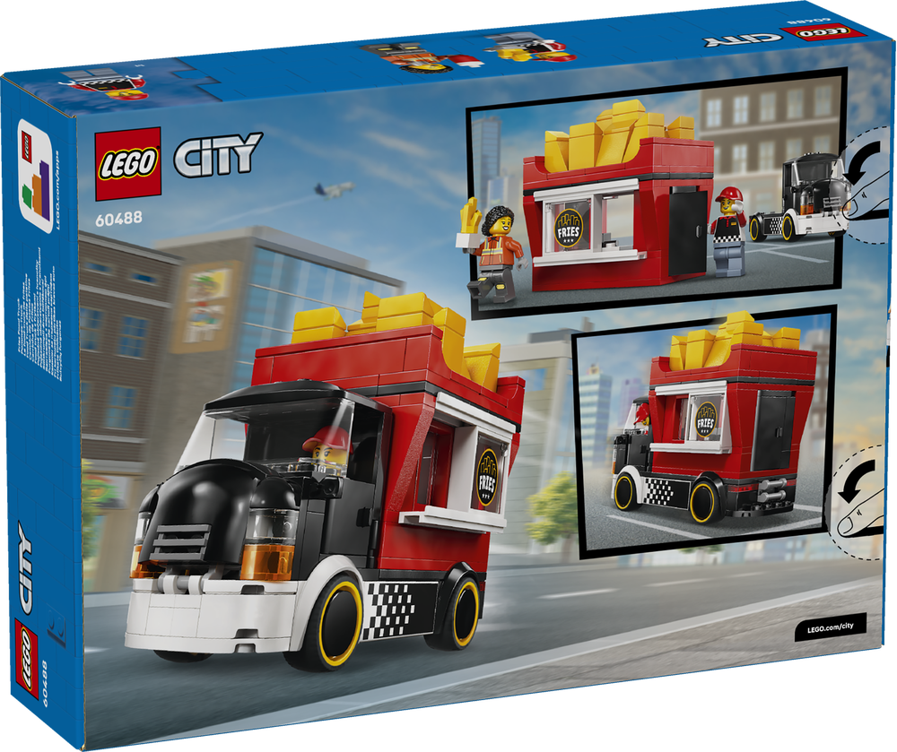 Der LEGO® City Pommes-Truck (60488) lässt Kinder ab 5 Jahren leckere Pommes zubereiten und servieren. Auf dem farbenfrohen Imbisswagen befindet sich ein abnehmbarer Kiosk, der wie eine riesige Pommesschachtel aufgemacht ist. Kinder können das Dach abnehmen, um in die detailreiche Küche zu gelangen. Dort warten eine Friteuse, Zutaten und ein aufschiebbares Servicefenster. Der Imbisswagen hat auch eine aufklappbare Motorhaube mit Spielzeugmotor. Eine Minifigur verkauft die Pommes, die andere isst die leckeren Fritten.