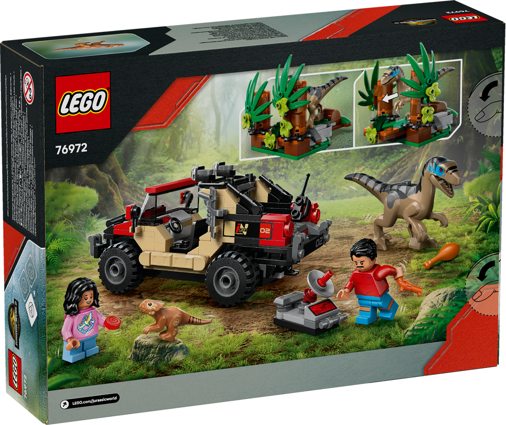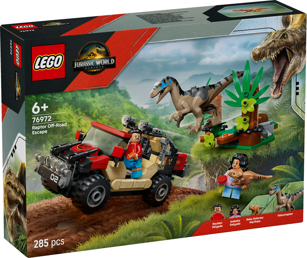 LEGO® Jurassic World Raptor: Verfolgungsjagd mit dem Geländewagen (76972) ist ein Set zum Film Jurassic World Rebirth, in dem Kinder und Fans ab 6 Jahren einige Überraschungen erwarten. Nach dem Bauen des Spielsets können Kinder ihre Lieblingsfilmszenen nachspielen oder neue Geschichten mit den Minifiguren Reuben und Isabella Delgado, dem kleinen Dino Baby Dolores und einem Velociraptor mit aufklappbarem Maul darstellen. Das Bauset beinhaltet außerdem einen Geländewagen, ein Aufspürgerät und einen Busch mit drückbarer Schreck-Funktion. Diese kann beim Spielen mit dem Velociraptor benutzt werden.