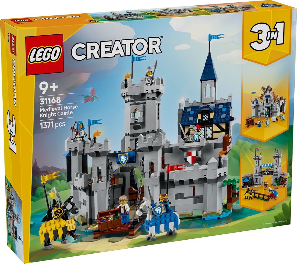 3 verschiedene Modelle aus dem Mittelalter, die nicht gleichzeitig gebaut werden können, laden Kinder zu Rollenspielen und Actionabenteuern ein – eine Ritterburg, ein Turnierplatz für Ritterspiele oder eine Stadt