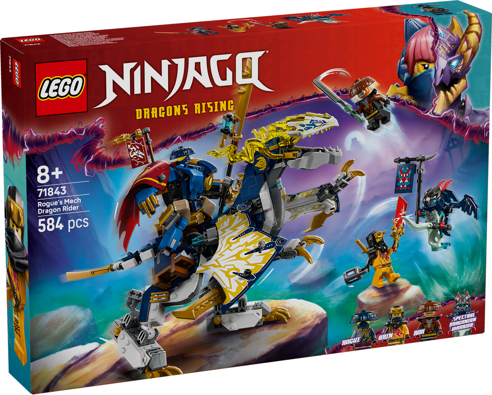 Rogues Mech-Drachenreiter (71843) lässt Jungen und Mädchen ab 8 Jahren Geschichten aus der 3. Staffel der TV-Serie NINJAGO® Aufstieg der Drachen nachstellen. Kinder können zunächst mit dem Spielzeugmech und dem allerersten NINJAGO Roboterdrachen spielen, und die beiden Spielzeugfiguren dann zu einer megastarken Actionfigur kombinieren – Rogues Mech-Drachenreiter.