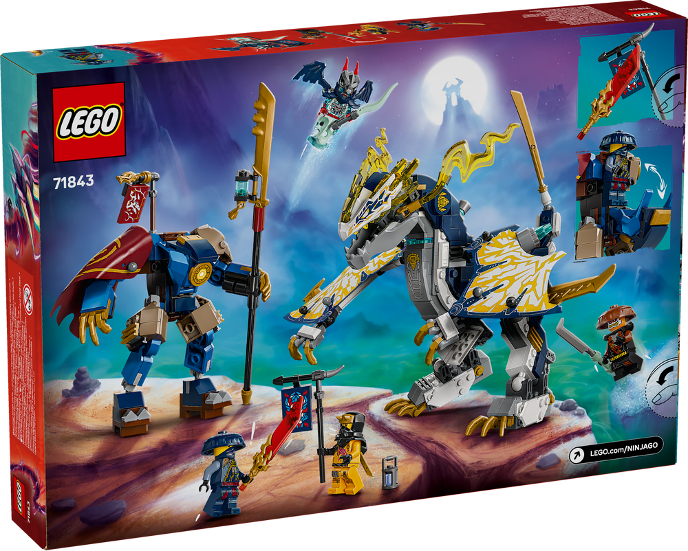 Der Spielzeugmech hat bewegliche Arme und Beine sowie eine aufklappbare Brust, in die eine Minifigur und ein Schwert hineinpassen. Der Drache kann Flügel, Beine und Kiefer sowie Kopf und Schwanz bewegen und schwingt ein Schwert. Auch 4 Minifiguren laden zum Spielen ein: die beiden Ninja Rogue und Arin sowie Rox und ein böser Geisterdrachenkämpfer. Die beiden Bösewichte haben ein Banner mit einer geheimen Botschaft, die nur mit Arins Enthüllungsklinge entschlüsselt werden kann.