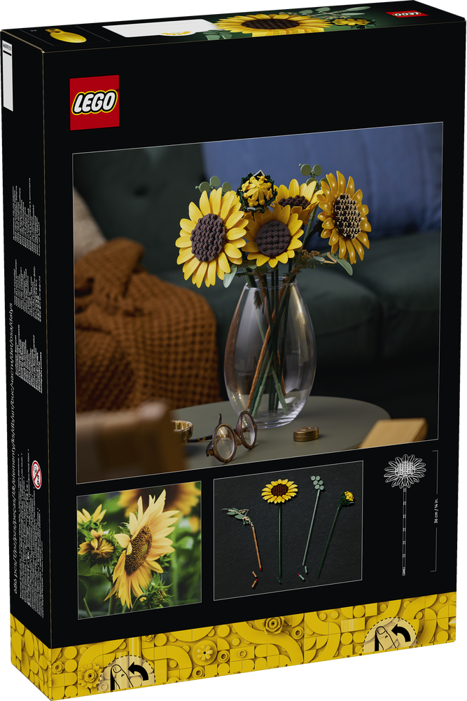 Dieses LEGO Bauset für Erwachsene beinhaltet 6 unterschiedlich weit geöffnete Sonnenblumen. Freu dich darauf, 1 Sonnenblumenknospe, 3 Sonnenblumen, die gerade erst aufgehen, und 2 große voll geöffnete Sonnenblumen sowie 4 Eukalyptuszweige zu bauen. Diese LEGO Blumen sollen besonders echt aussehen. Die Blütenblätter und Stängel lassen sich anpassen, damit Blumenfans den Strauß ganz individuell gestalten und dann ausstellen können. Die Blumen können aber auch mit anderen separat erhältlichen LEGO Botanicals Sets zu einer größeren Blumendeko kombiniert werden.