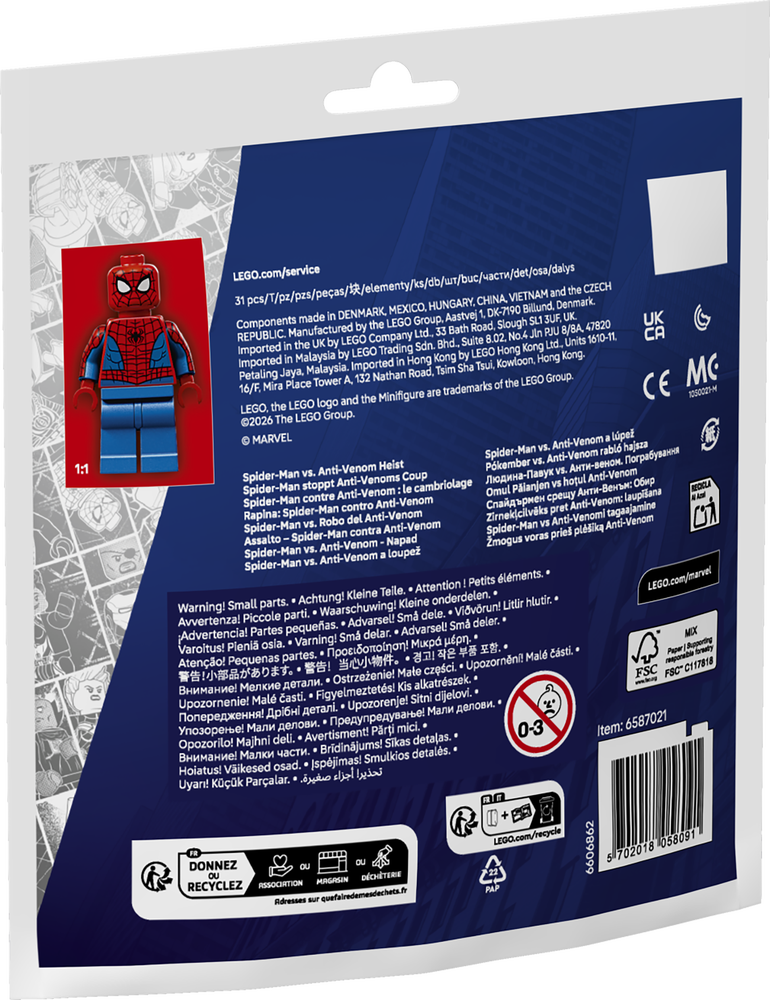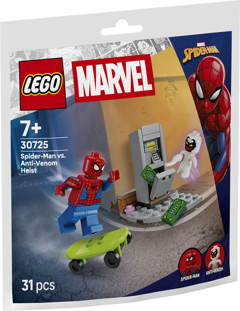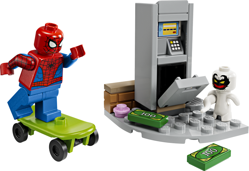 In dem LEGO® Marvel Set (30725) Spider-Man Stoppt Anti-Venoms Coup bricht Anti-Venom einen Geldautomaten an der Straßenecke auf. Spider-Man sieht, wie der Bösewicht mit einem Geldbündel davonläuft und jagt ihm auf dem Skateboard hinterher.
