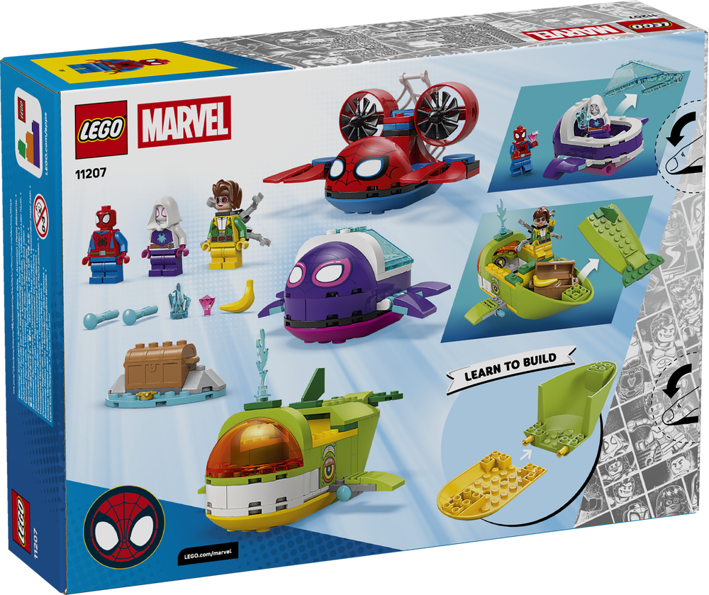 LEGO® ǀ Marvel Spidey: Unterwasserfahrzeuge (11207) schickt Marvel-Fans ab 4 Jahren in viele Unterwasserabenteuer. Beim Spielen mit den Minifiguren Spidey, Ghost-Spider und Doc-Ock in ihren 3 U-Booten entwickeln Kinder viele kreative Fähigkeiten.