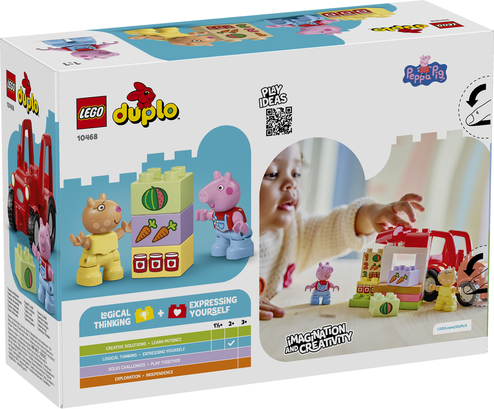 LEGO® DUPLO® Peppa Wutz Traktor und Marktstand (10468) ist ein Bauspielzeug, das Kleinkinder ab 2 Jahren Szenen aus ihrer Lieblingsserie nachspielen und so tun lässt, als würden sie einen Marktstand betreiben