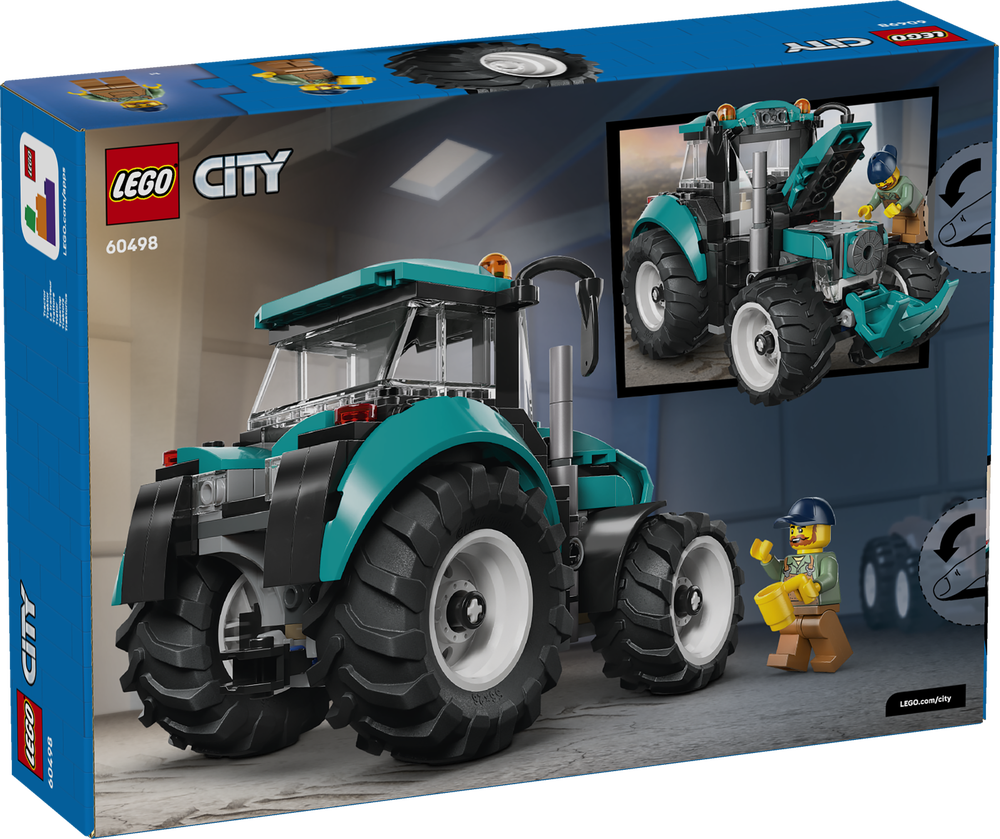 Der LEGO® City Traktor (60498) lässt Kinder ab 6 Jahren fantasievoll spielen. Das detailreiche Landwirtschaftsfahrzeug hat eine blaugrüne Lackierung und 4 große Gummireifen. Junge Baufans können das Kabinendach abnehmen, um die Minifigur hineinzusetzen. Wenn sie die Motorhaube öffnen, können sie den Motor kontrollieren, bevor sie auf den Acker hinausfahren.