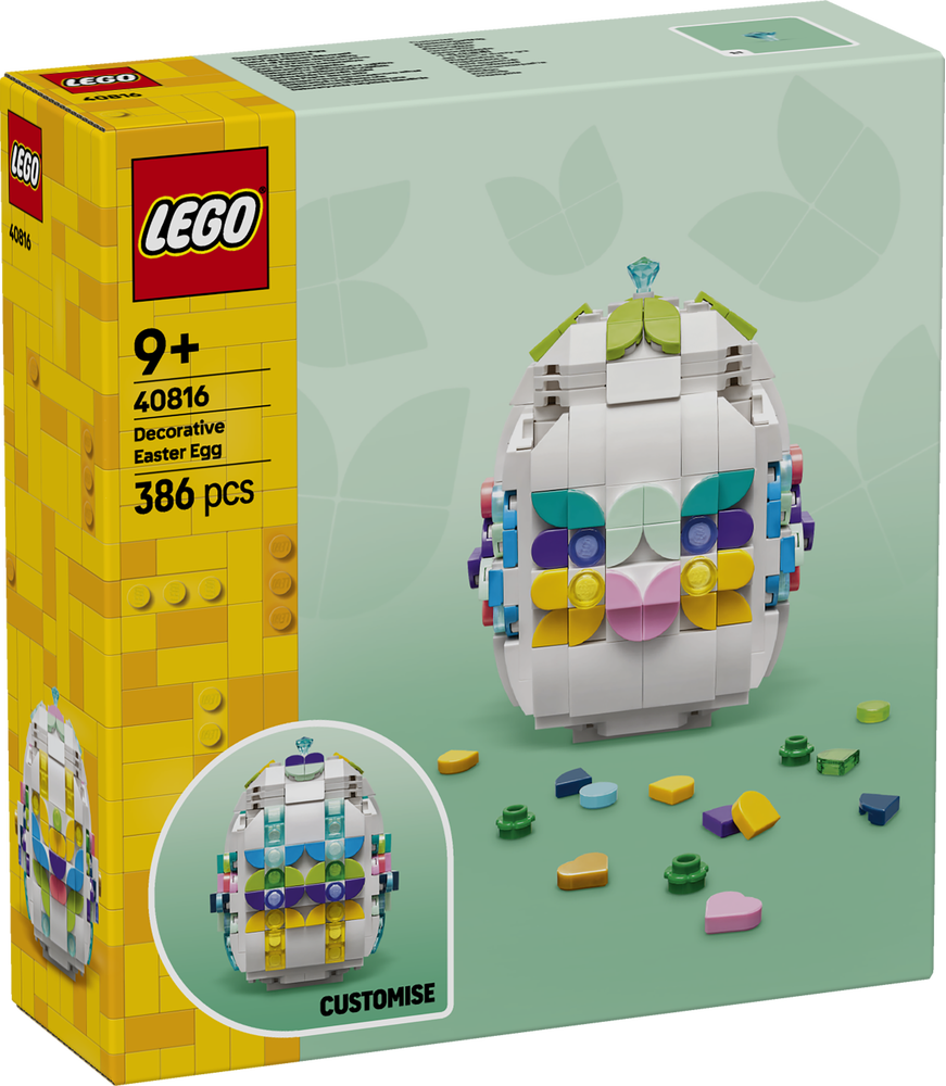 Verziertes Osterei (40816) ist ein LEGO® Geschenkset, das Kinder ab 9 Jahren Ostern feiern und kreativ werden lässt. Hol deine Freunde und deine Familie zusammen, um miteinander Eier nach LEGO Art zu „bemalen“. Dieses Bauset lässt dich dein eigenes Osterei bauen und mit farbenfrohen LEGO Elementen verzieren. Ein goldenes Herz und ein kleiner Edelstein sind nur zwei dieser bunten Zierelemente. Dank des flachen Bodens kann man das Ei mühelos ausstellen. Und der aufklappbare Deckel kann abgenommen werden, um die übrigen Zierelemente aufzubewahren oder vielleicht eine weitere Osterüberraschung in dem Ei zu verstecken.