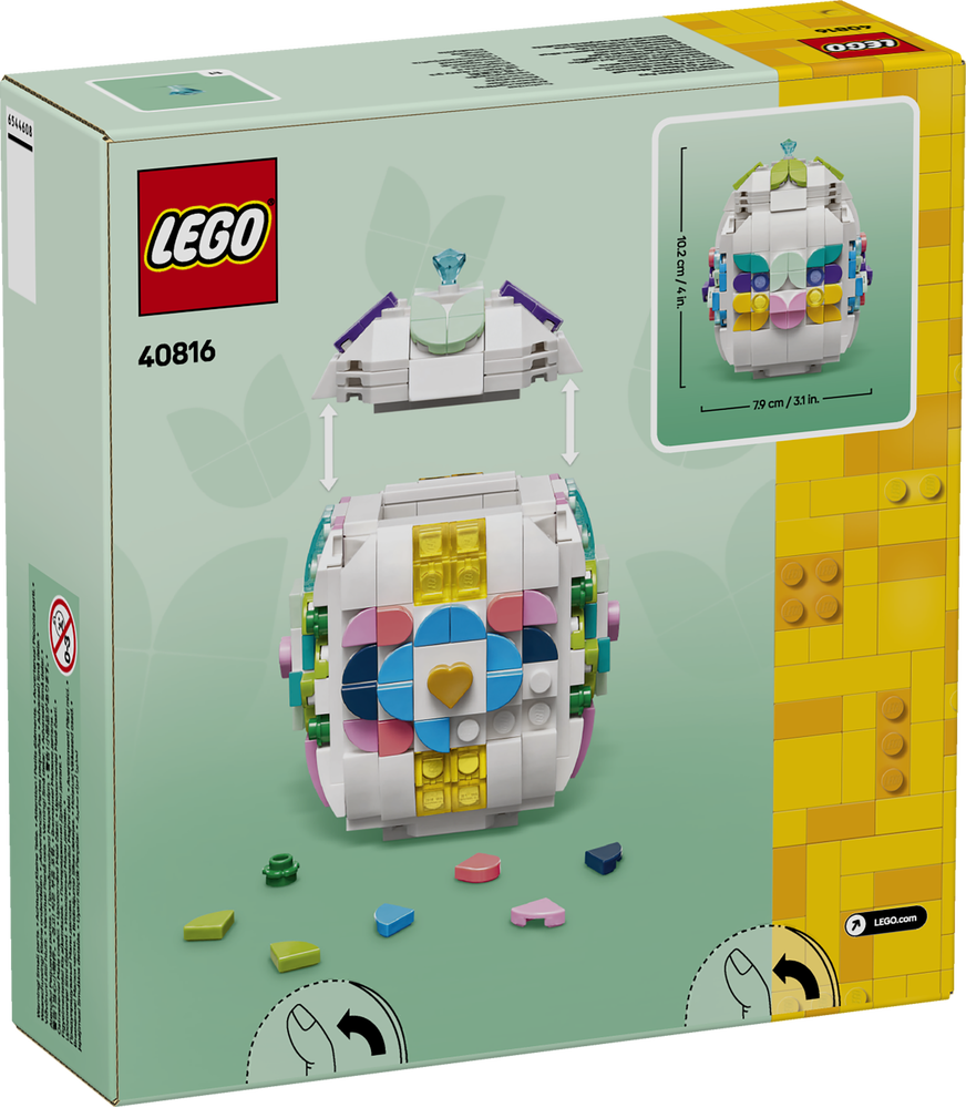 Das Set beinhaltet ein baubares Osterei mit abnehmbarem Deckel und spezielle Zierelemente (unter anderem ein goldenes Herz und einen Edelstein). In dem Ei kann man die nicht benutzten Zierelemente aufbewahren