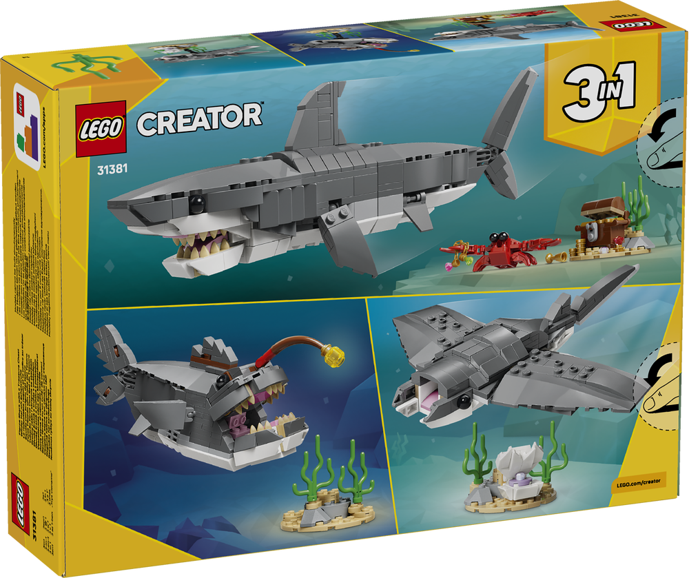 Das LEGO® Creator 3-in-1-Set Wilder Hai mit Schatztruhe (31381) lässt Jungen und Mädchen ab 8 Jahren 3 verschiedene Meerestiere mit denselben LEGO Steinen bauen